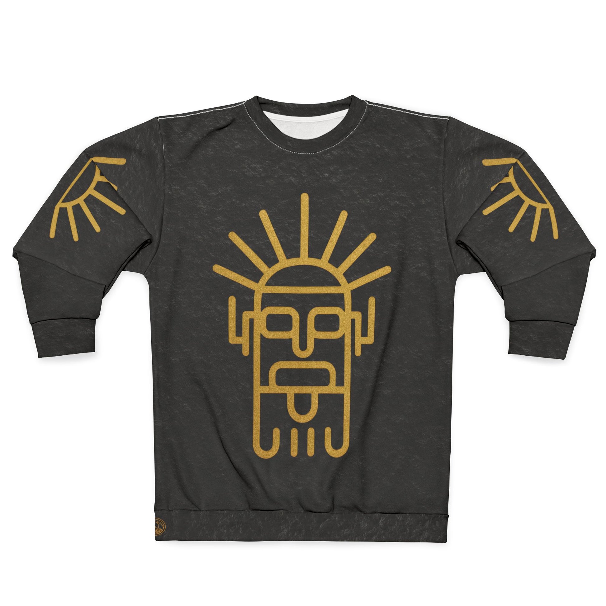 Inti Lineage is a tribute to the radiant heritage of the Andean sun. A golden mask rises from deep charcoal tones, surrounded by stylized sunbeams that glow like ancient light meeting a modern pulse. Bold, sacred, and unmistakably geometric — this sweatshirt carries the warmth, protection, and strength of a timeless lineage.