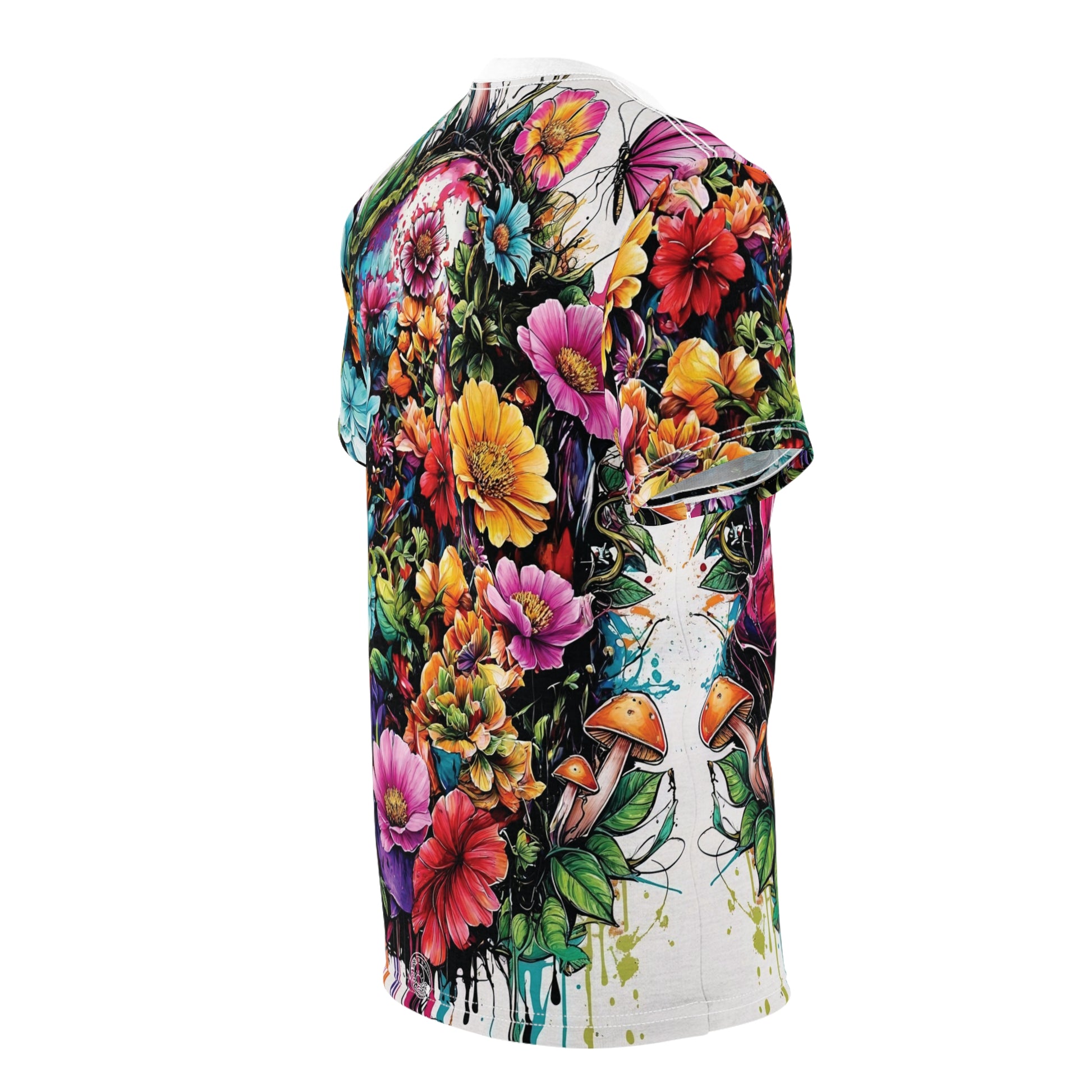 The front of this piece shows a vibrant skull, pulsing with color, surrounded by mushrooms, vines, and butterflies — a symbol of transformation and raw vitality.