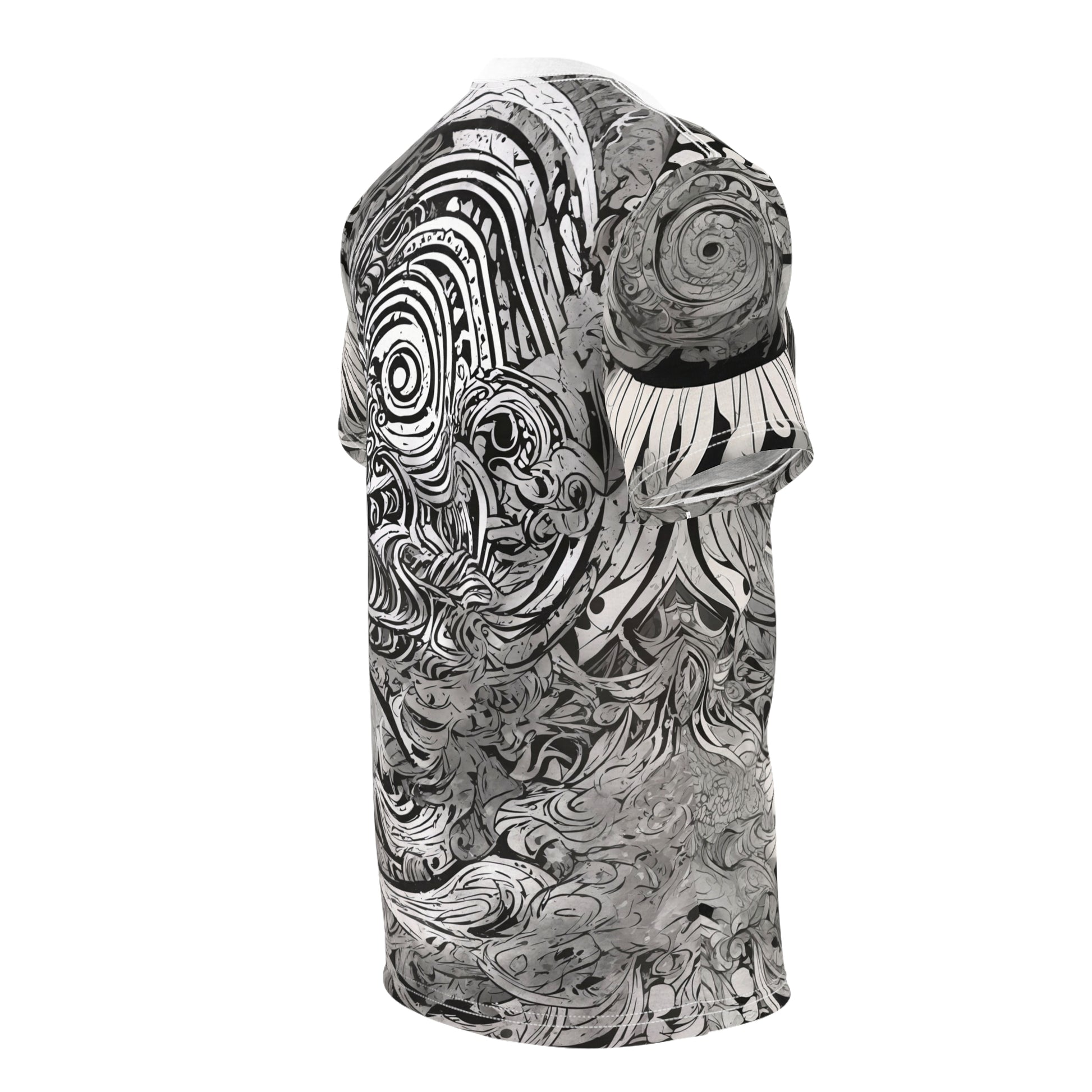 Dive into a dreamlike tide with our Mystic Wave all-over print tee and sweatshirt. Inspired by the hypnotic patterns of the ocean, sacred symbols, and the flowing energy of nature, this shirt blends ancient tribal motifs with modern psychedelic art.