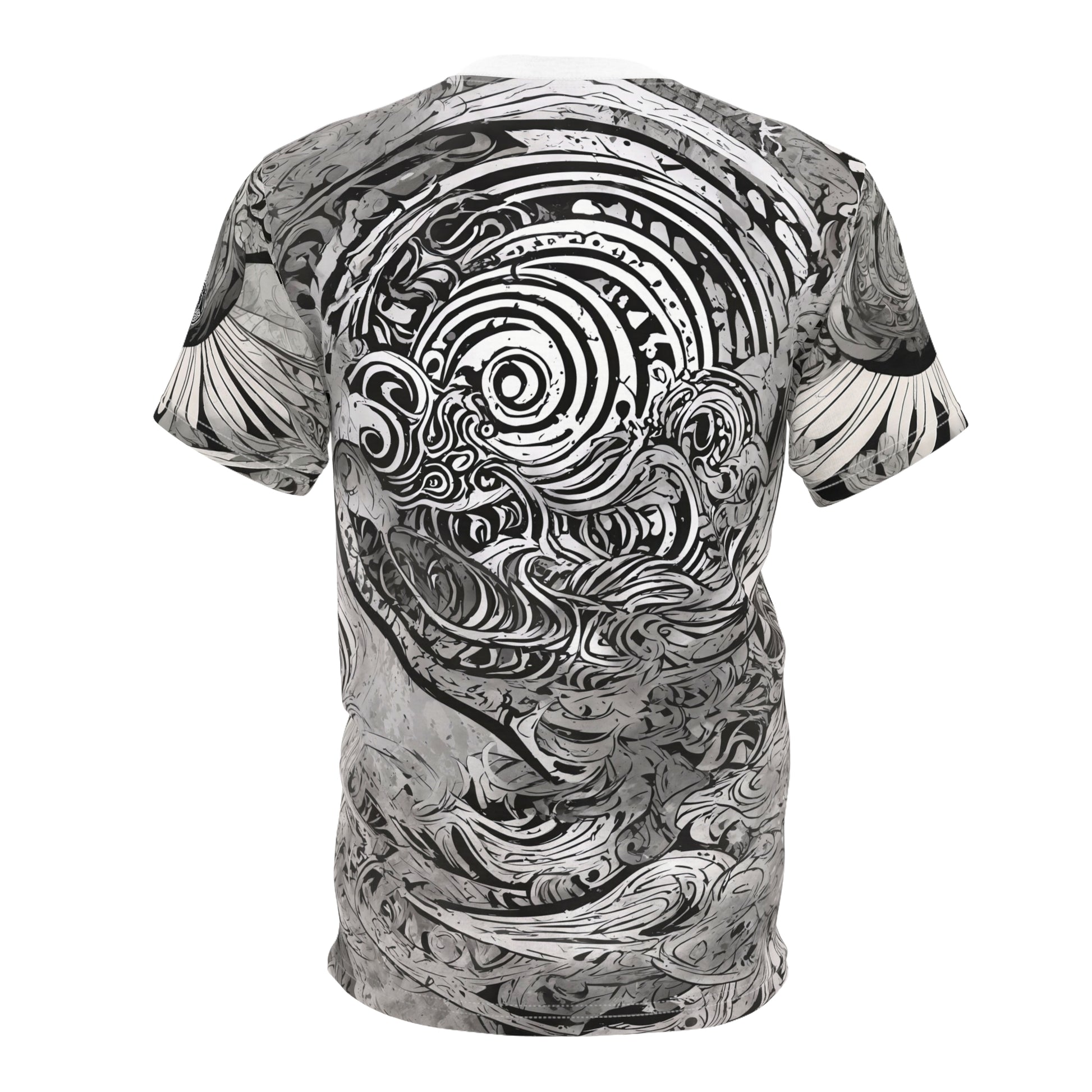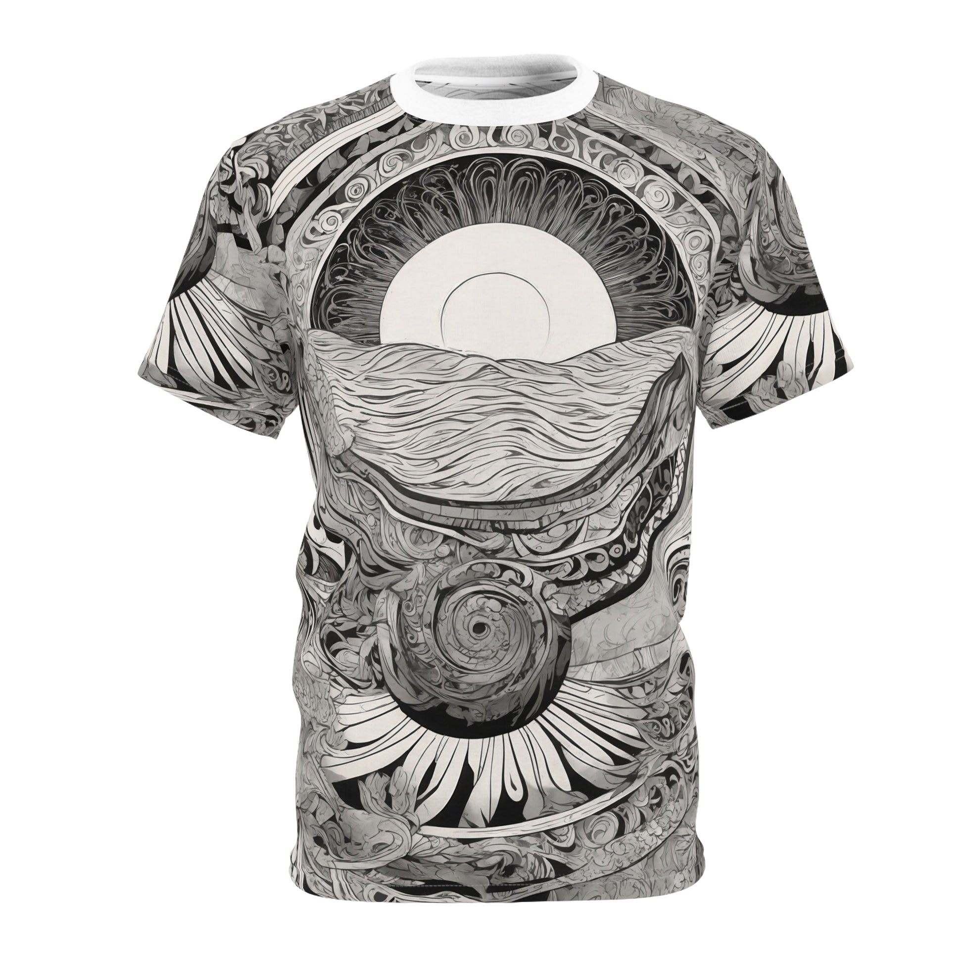 The design features a mesmerizing sun rising over stylized waves, spiraling into abstract floral forms that evoke both mystery and motion. Printed in black and white for timeless contrast, it's a wearable piece of art for the free-spirited and style-conscious soul.
