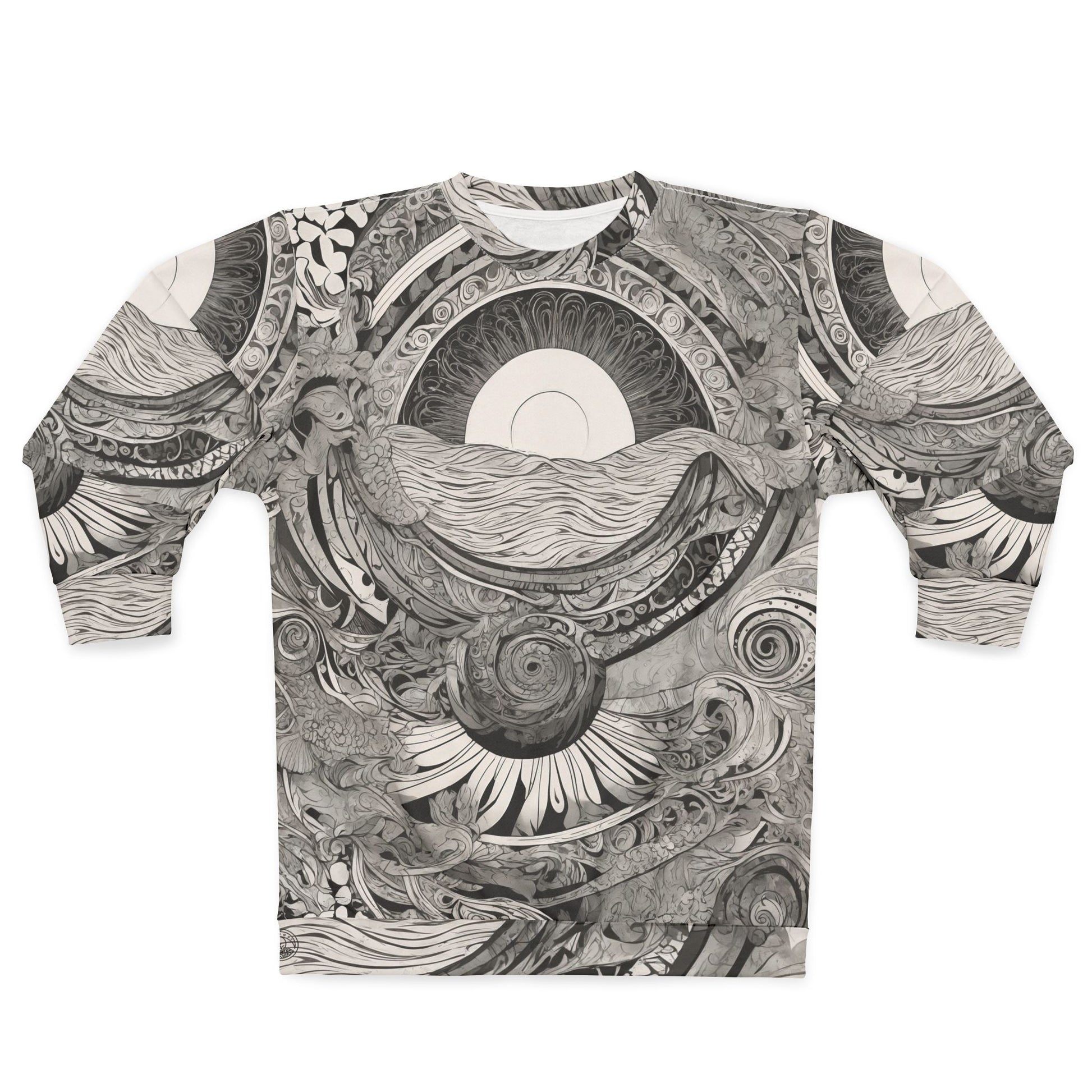 The design features a mesmerizing sun rising over stylized waves, spiraling into abstract floral forms that evoke both mystery and motion. Printed in black and white for timeless contrast, it's a wearable piece of art for the free-spirited and style-conscious soul.